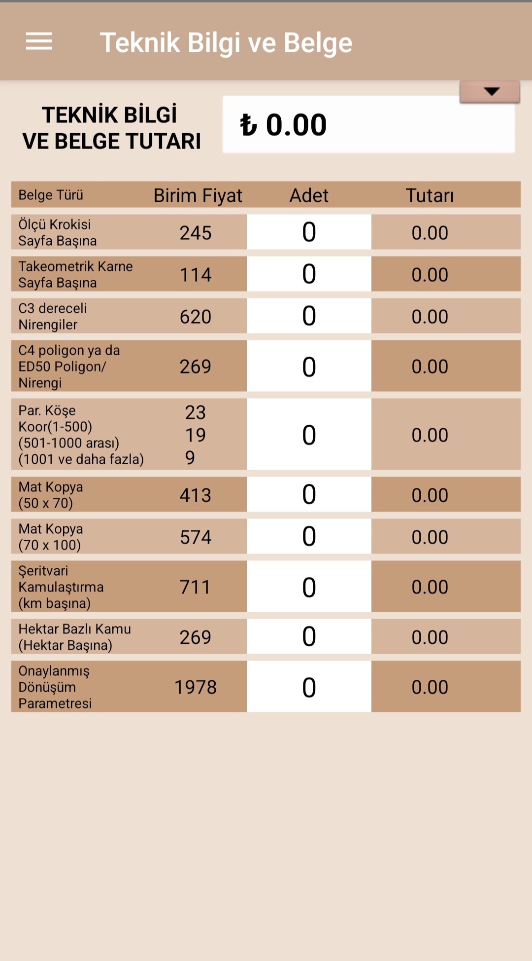 Kadastro Müdürlükleri ve Birimlerinde Teknik Bilgi ve Belge işlem ücretini hesaplar.