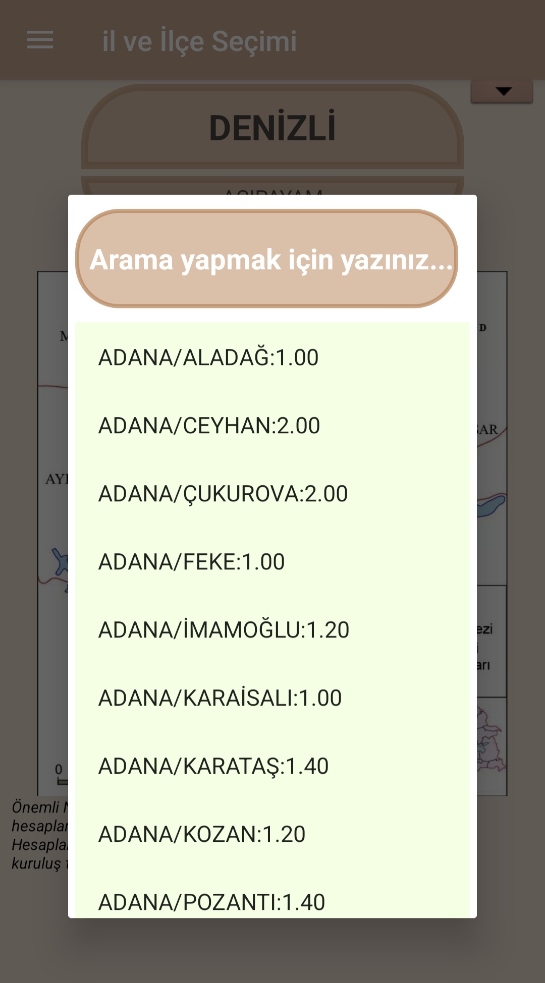 Uygulamamda tüm il ve ilçelerimize ait katsayı çarpanları mevcut olup hesaplamalar il ve ilçe katsayısına göre hesap yapılmaktadır.